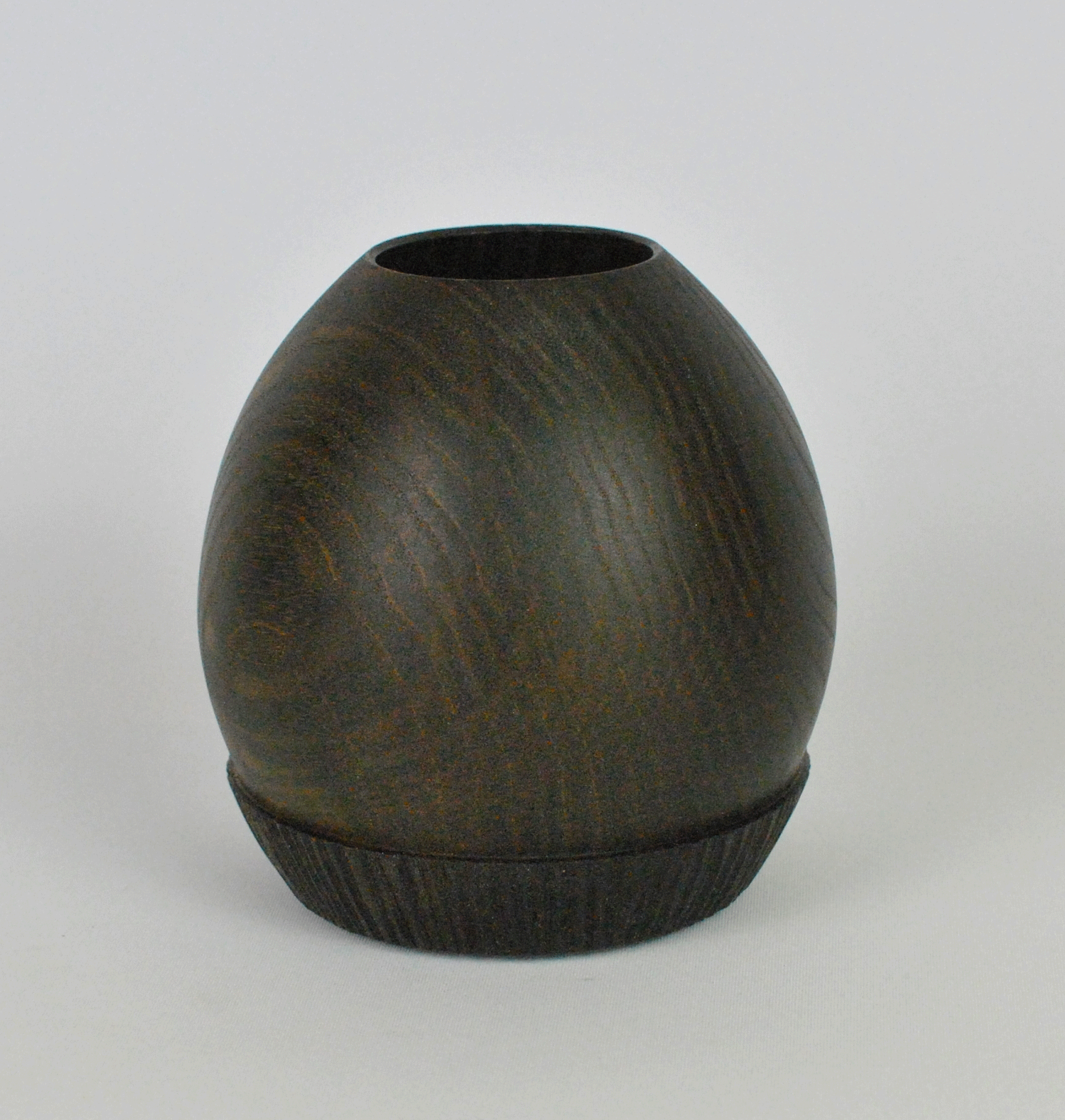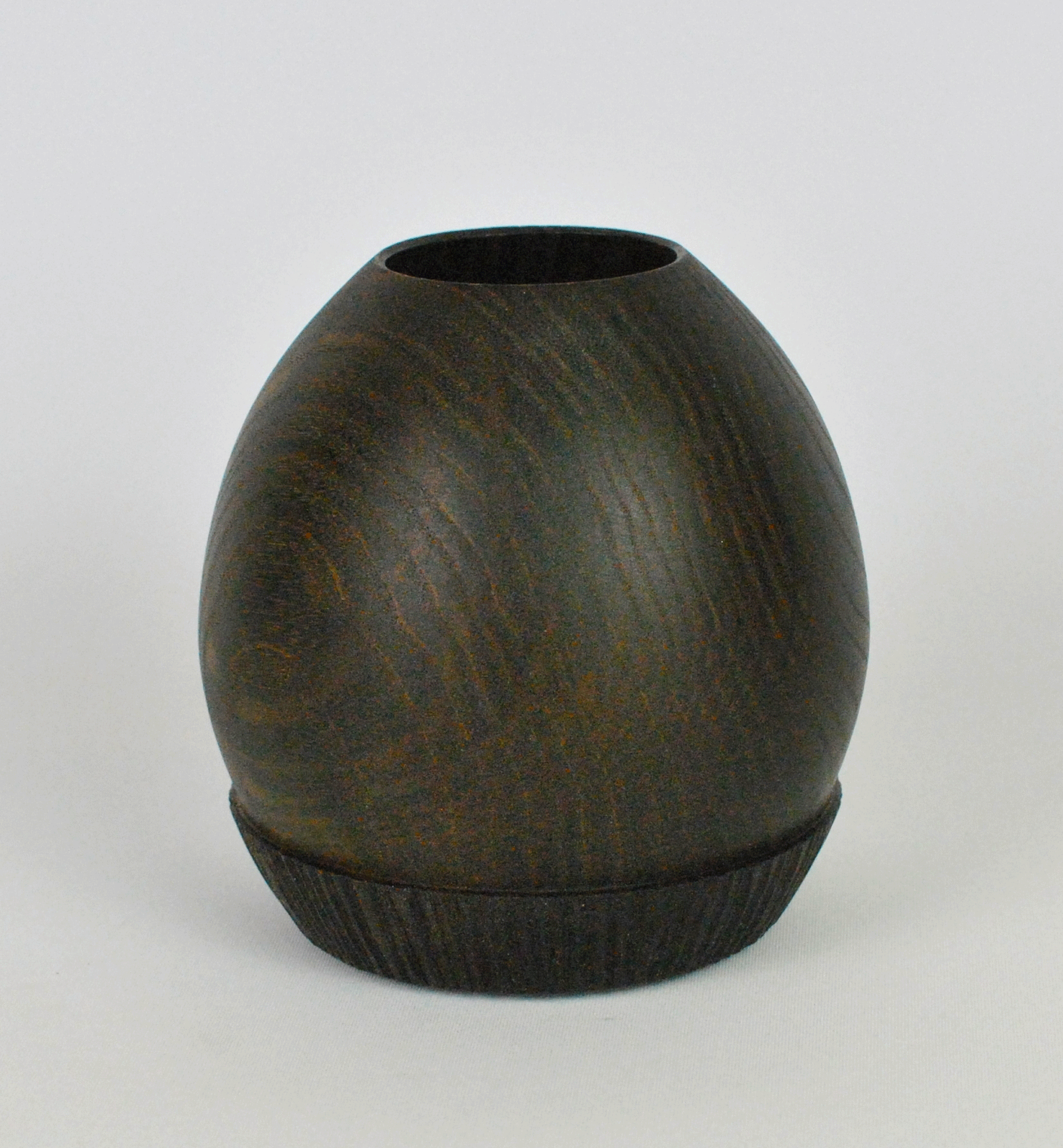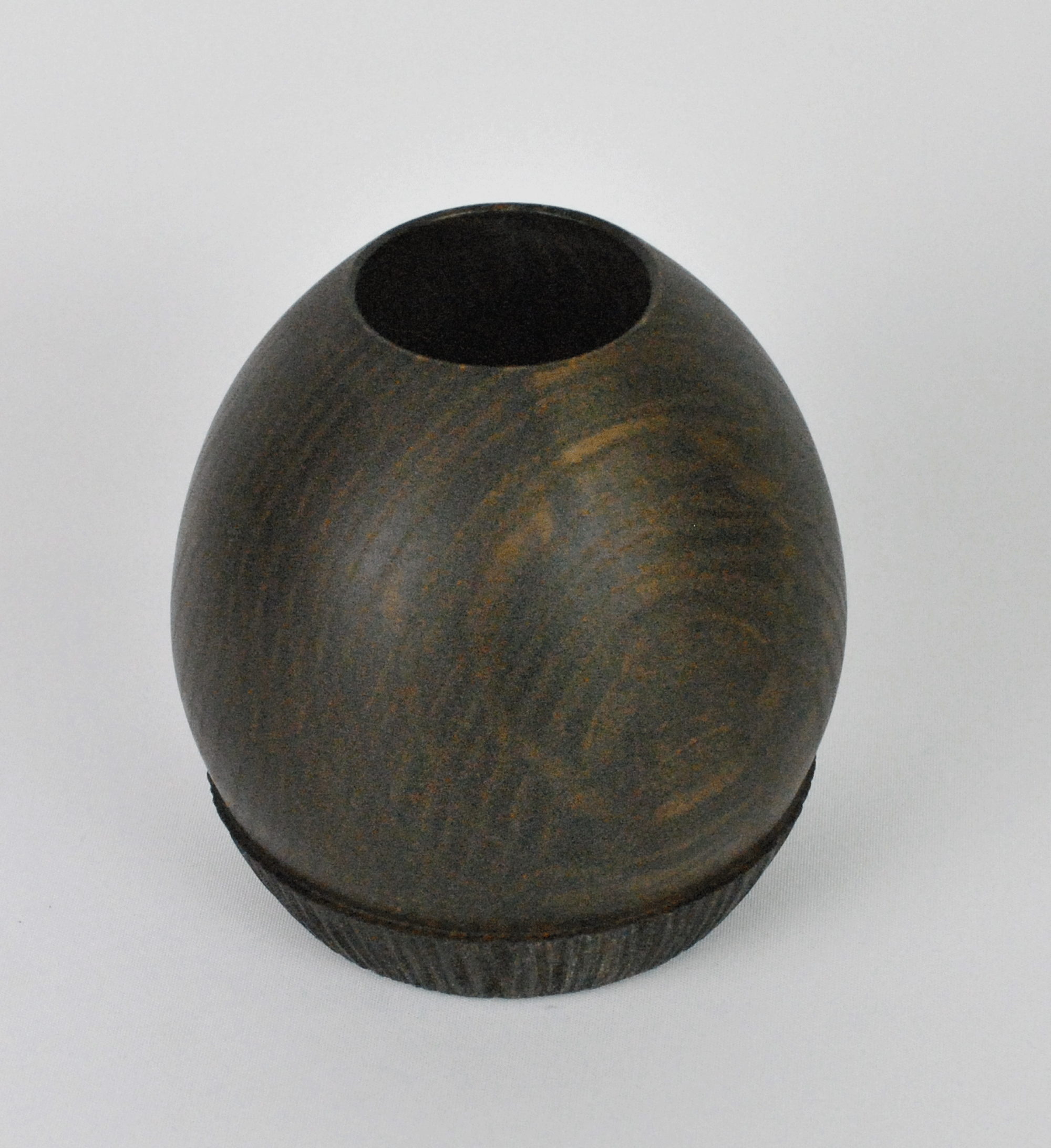 Native Irish Ash hollow form vessel featuring an ebonised finish . This vessel measures 4 1/2  ( 115 mm ) inches in height and 4 1/4 ( 108 mm )  inches in diameter. The vessel features a textured base.