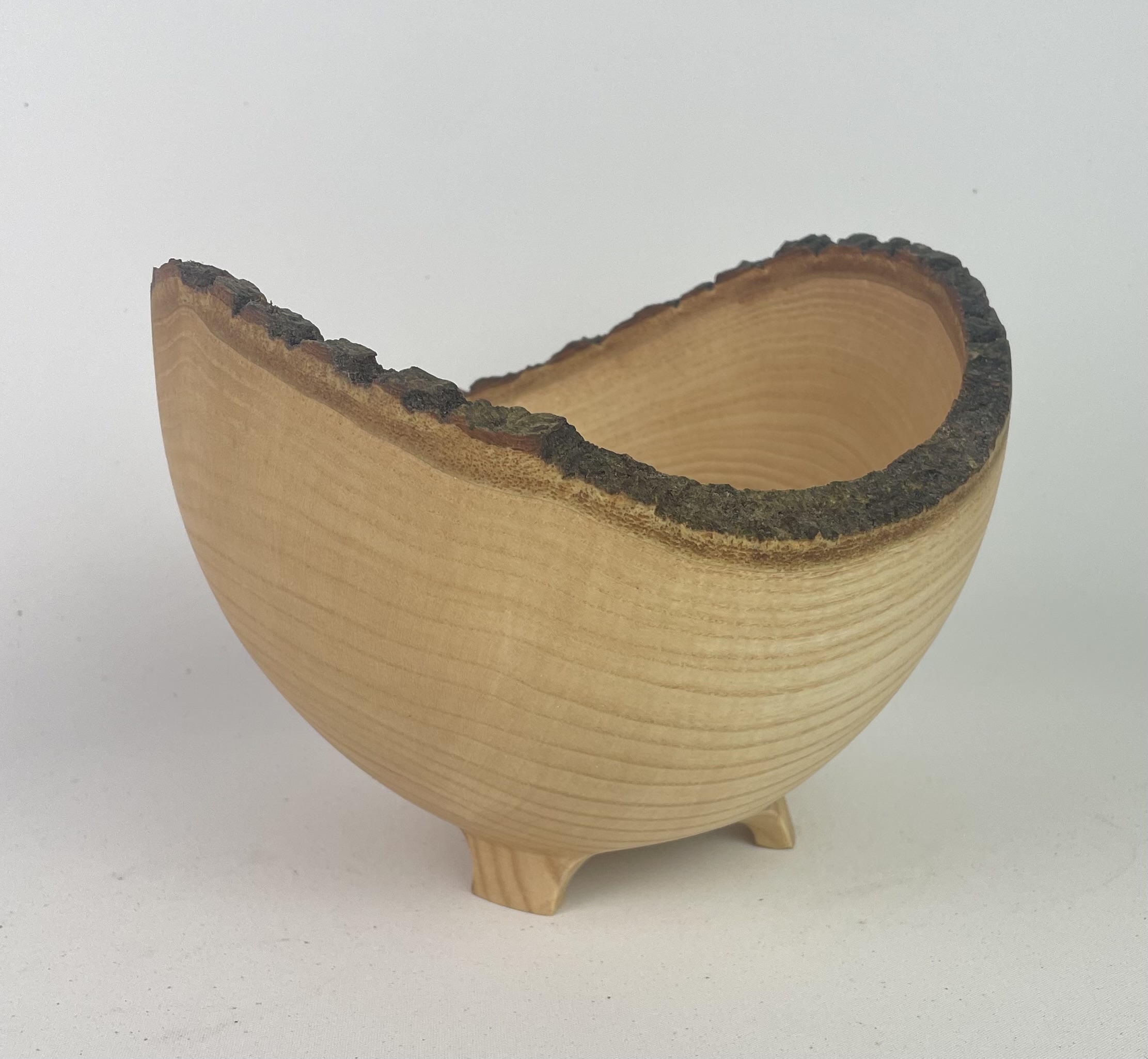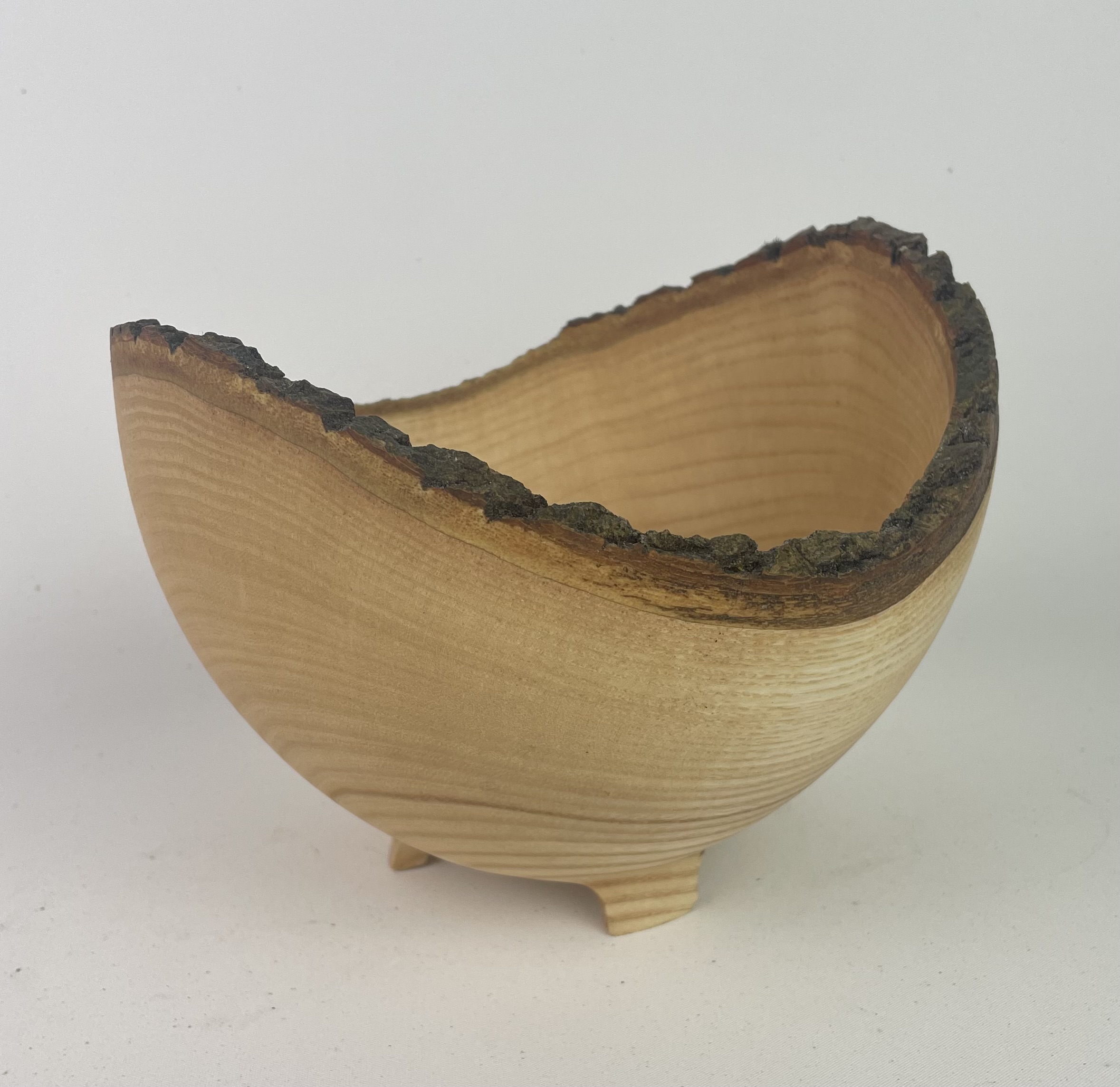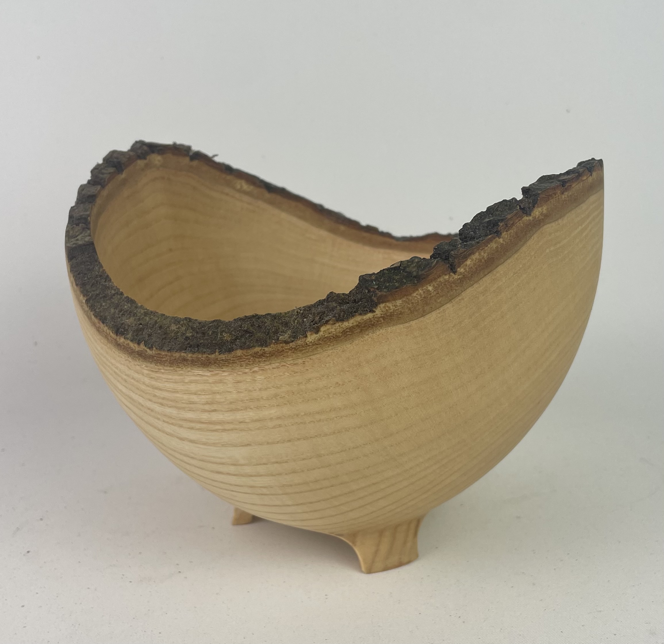 Wonderful Irish Ash live edge vessel standing on three carved feet.